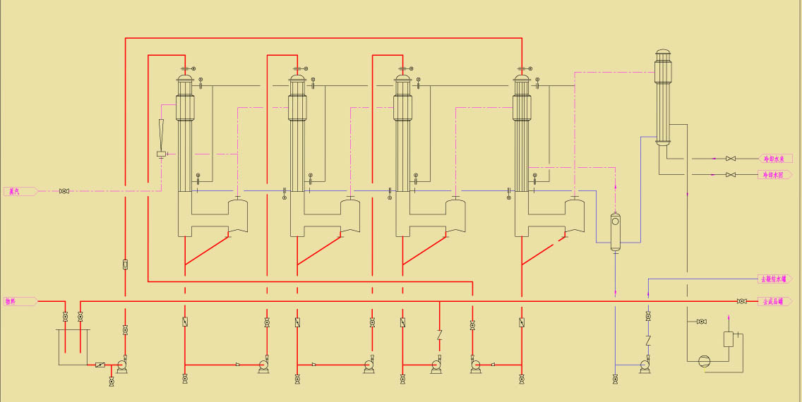 在降膜式蒸发器中,液体和蒸发汽向下并流流动;物料在沸点温度下进入蒸发器,通过蒸发器顶部的液体分布装置,均匀地沿加热管壁成膜状向下流,在向下流的过程中不断的蒸发,不断地被管外的蒸汽加热。降膜蒸发器具有传热系数大,物料在加热过程中由于停留时间短而变性小等特点。降膜蒸发器广泛应用化学、制药、天然有机产品和食品工业等。降膜式蒸发器还具有开车快捷、容易切换至清洗操作模式或浓缩另一种产品、适应能力强、可控性好、能耗低等强大优势;可以预见降膜式蒸发器将在众多应用领域替代其它类型的蒸发装置并将不断完善。